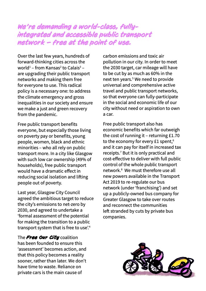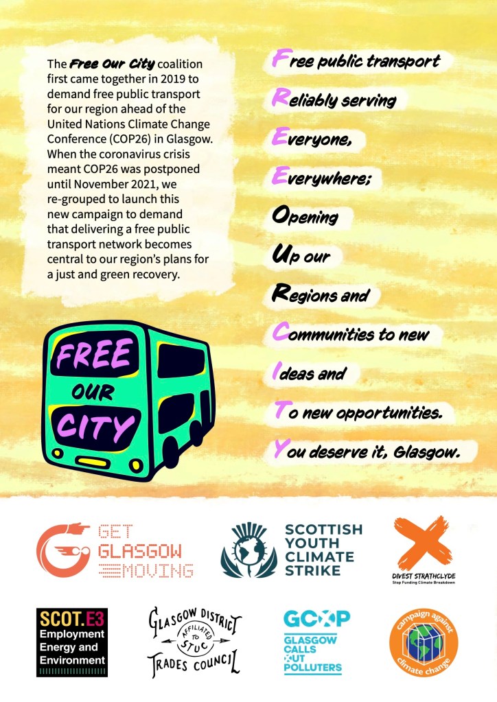 Free Our City is a new coalition of community, trade union and environmental groups campaigning for Glasgow to be the next city to make its public transport free (see our leaflet attached).