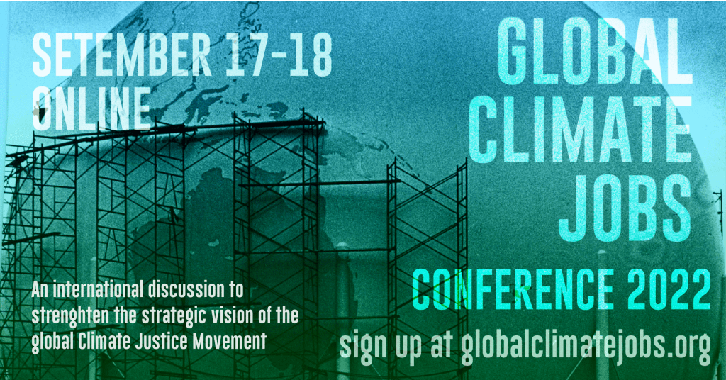 The Global Climate Jobs Network is organising an online international conference Friday June 3 to Sunday June 5, 2022. This will be online to make it easy for activists and organisations to participate from all over the world.