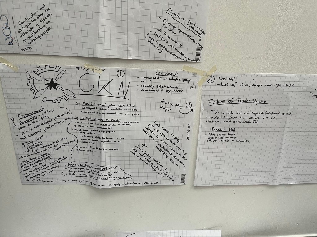 On the second day of the conference, I helped present and facilitate a workshop on the strike wave in Britain put on by the socialist group rs21. We explored the scale of the movement and attempts to align it with the environmental movement. This provoked a lively discussion and people gave examples from 7-8 different countries of experiments in aligning the workers and environmental movement, including pushing for the wider ecosocialist political struggle. As part of the workshop, we hosted a representative from the Italian GKN Collective. GKN is a British owned company in the automotive and aerospace sector. Faced with a decision to close the factory the Italian workers occupied in 2021 and have stayed in occupation ever since. They are now fighting to control it; they’ve retooled the machinery and aim to convert it to renewable transport production led by workers. It’s quite shameful that this occupation has not received more support and solidarity in the UK. Coverage in English is very limited but you can read more here.