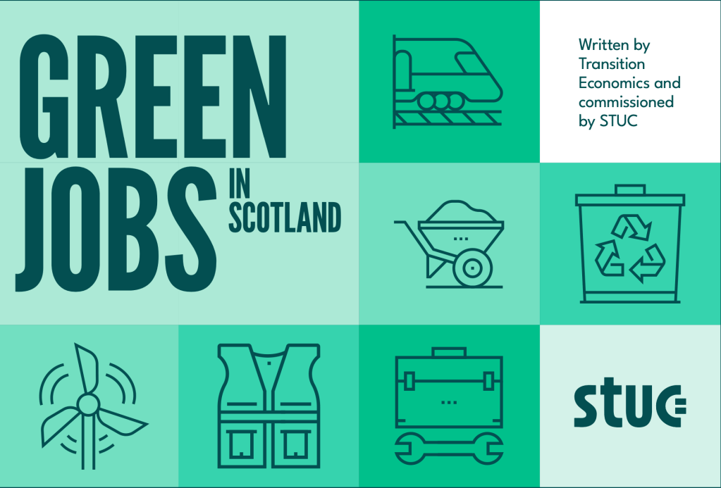 Written by Transition Economics, âGreen Jobs In Scotlandâ looks at how energy, buildings, transport, manufacturing, waste, agriculture and land-use need to be decarbonised, and sets out how Scotland can maximise green job creation, as well as fair work and effective worker voice in these jobs. It finds: