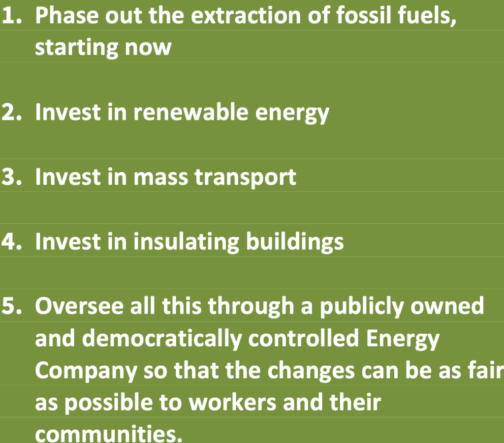 Transition and jobs growth will only happen if there is investment at scale and speed. Seeking to “moderate” Labour’s policy so that the investment doesn’t happen, means there will be no growth in jobs either. Without plans, and without union engagement in making them, we will stagnate at best. That is what we should be concentrating on now, so that mobilising people for transitions in their communities and workplaces that will cut their bills, boost jobs and cut our carbon emissions fast becomes part of the election campaign to drive the Tories out of office and cement Labour in government into actions that drive that forward.