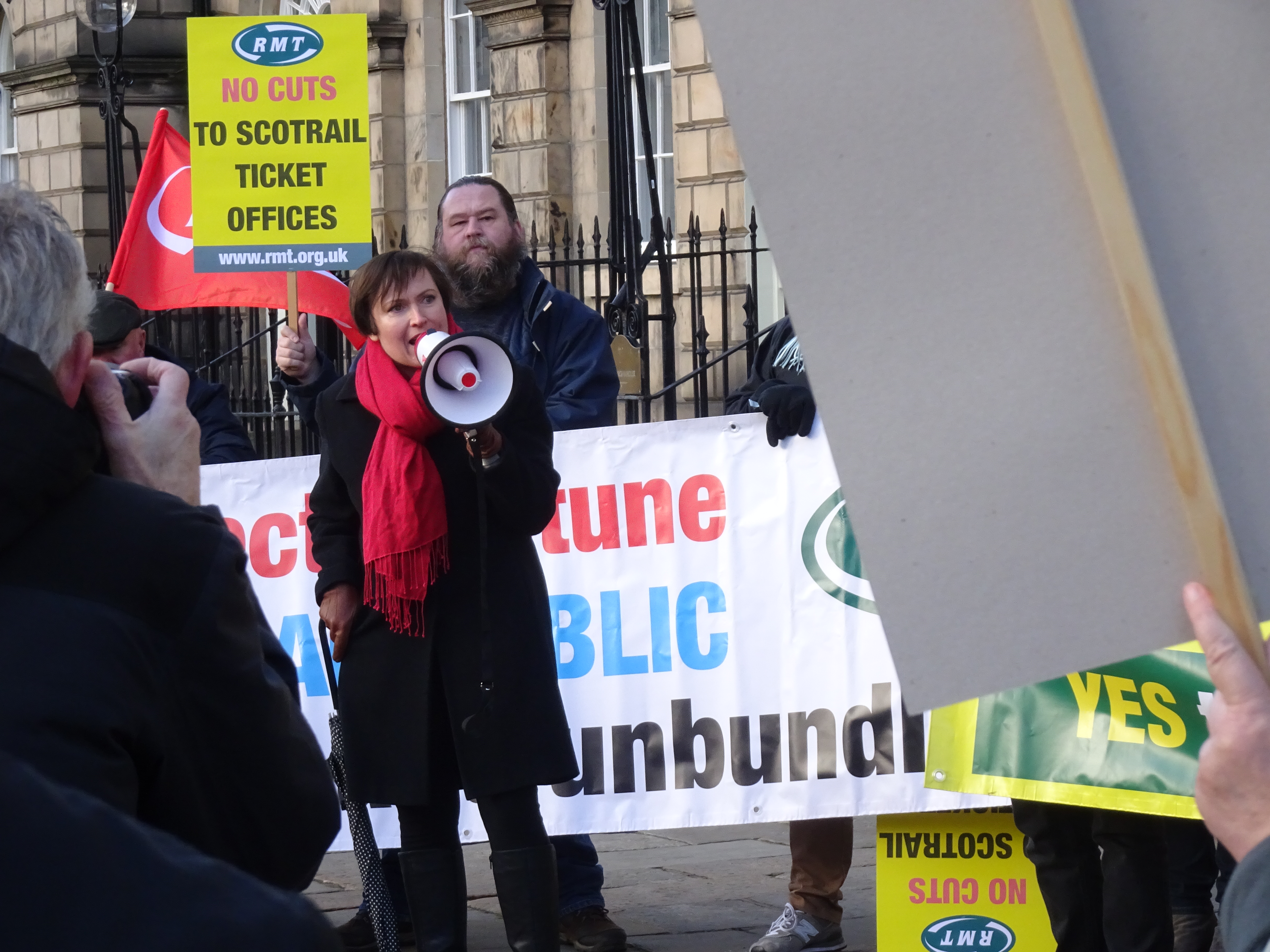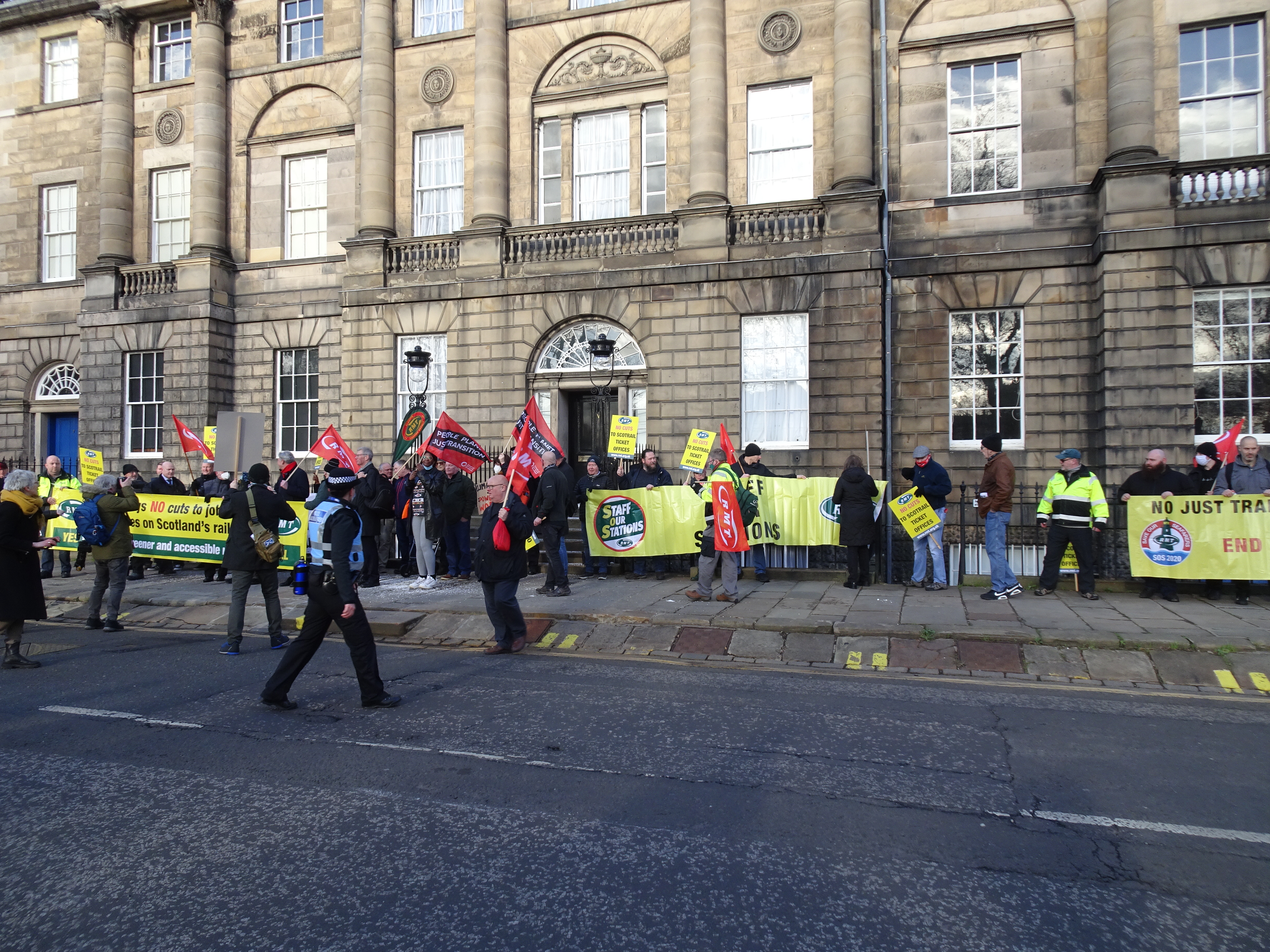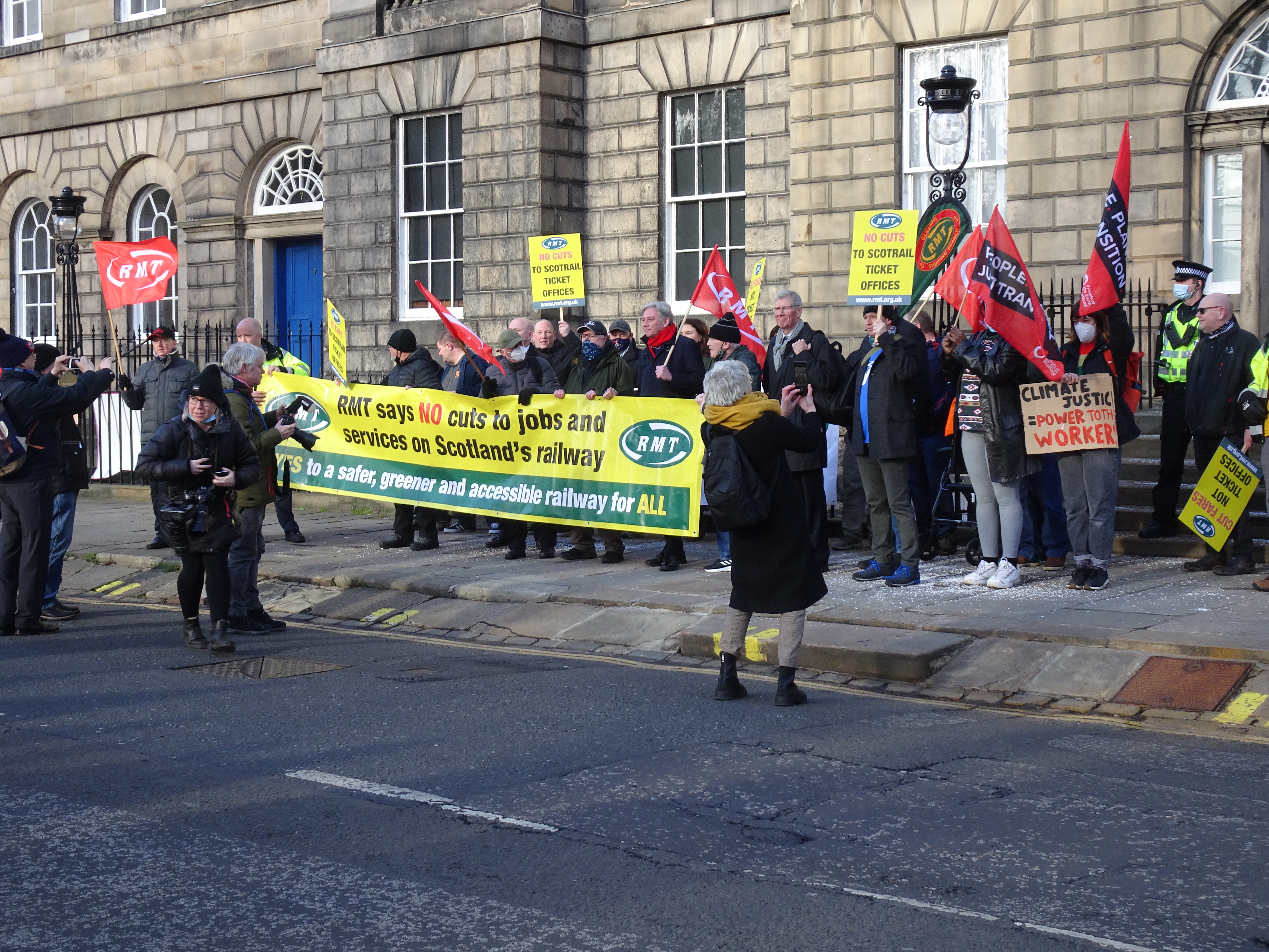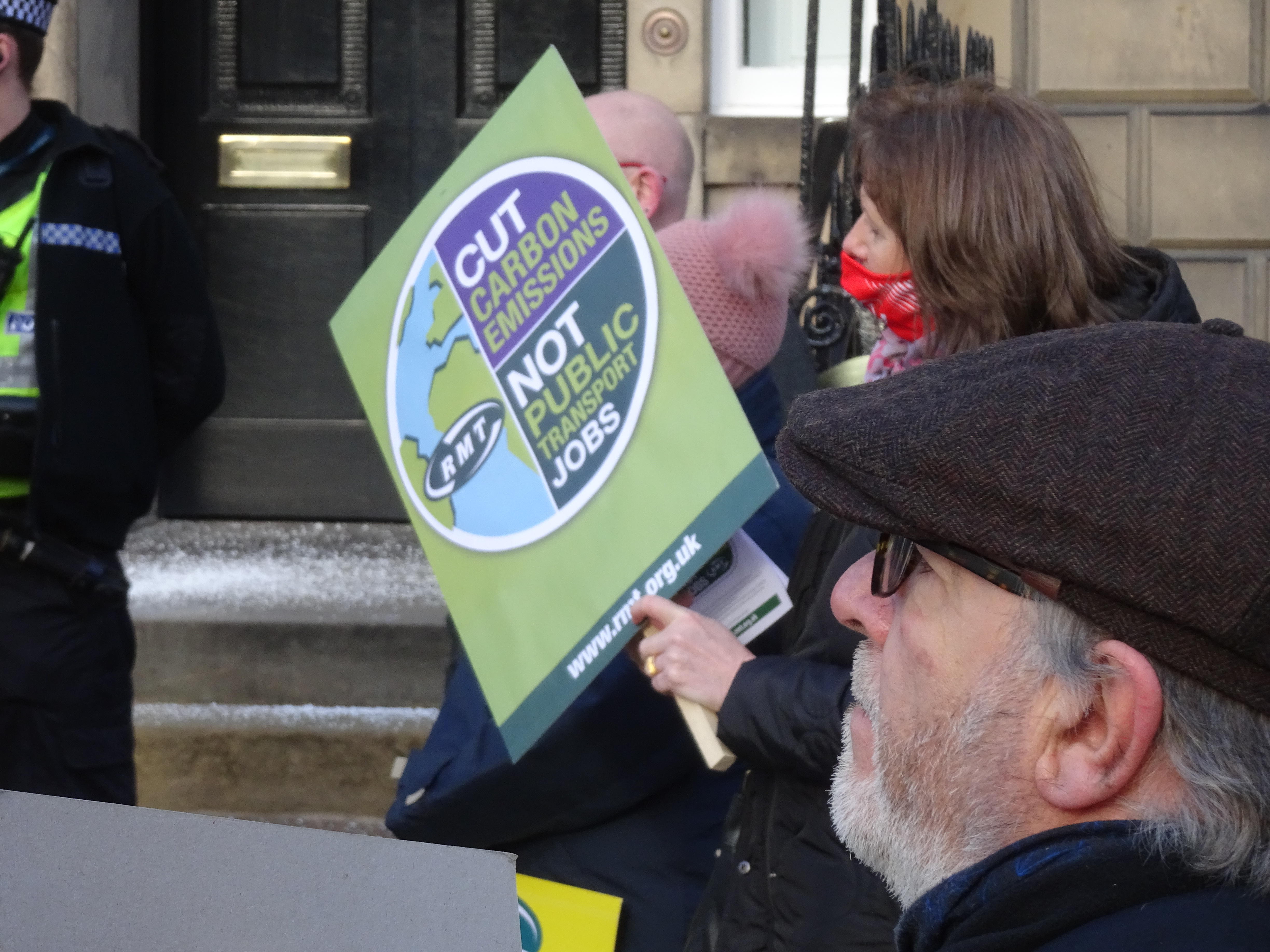 Transport workers, members of the RMT working for ScotRail and Calmac Ferries protested outside Bute House – the first minister’s official residence today. Several speakers stressed that cutting more than 300 services and closing ticket offices at many stations is unacceptable and particularly so only two months after politicians at COP26 were pledging to tackle the climate crisis. Trains and ferries are an essential part of Scotland’s transport infrastructure and critical to a zero carbon future.