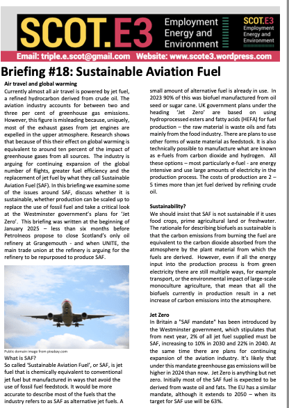 Currently almost all air travel is powered by jet fuel, a refined hydrocarbon derived from crude oil. The aviation industry accounts for between two and three per cent of greenhouse gas emissions. However, this figure is misleading because, uniquely, most of the exhaust gases from jet engines are expelled in the upper atmosphere. Research shows that because of this their effect on global warming is equivalent to around ten percent of the impact of greenhouse gases from all sources. The industry is arguing for continuing expansion of the global number of flights, greater fuel efficiency and the replacement of jet fuel by what they call Sustainable Aviation Fuel (SAF). In this briefing we examine some of the issues around SAF, discuss whether it is sustainable, whether production can be scaled up to replace the use of fossil fuel and take a critical look at the Westminster government’s plans for ‘Jet Zero’. This briefing was written at the beginning of January 2025 – less than six months before PetroIneos propose to close Scotland’s only oil refinery at Grangemouth – and when UNITE, the main trade union at the refinery is arguing for the refinery to be repurposed to produce SAF.